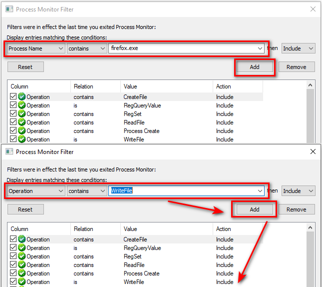 firefox.exe als "Process Name" und dann alle Schreibzugriffe protokollieren: