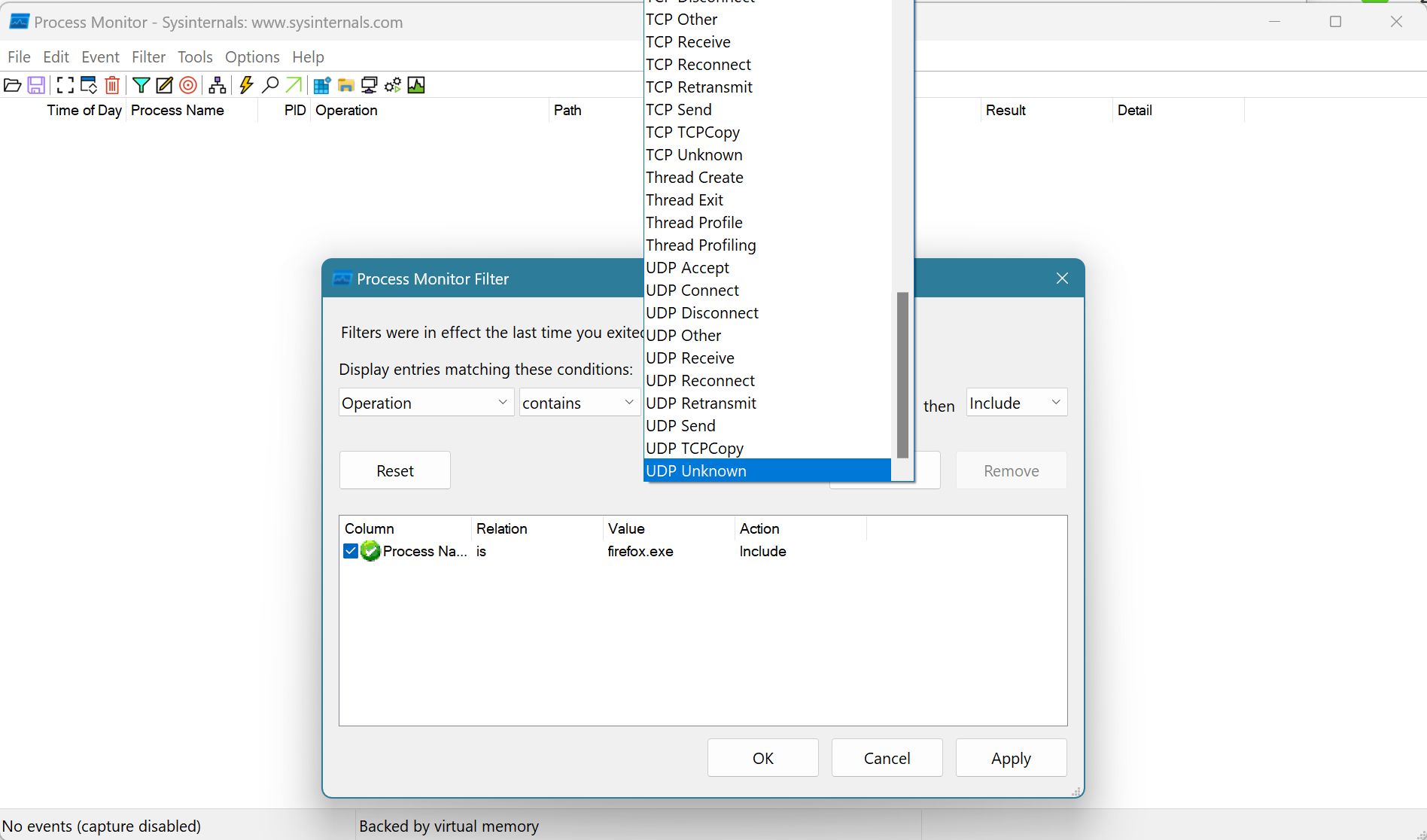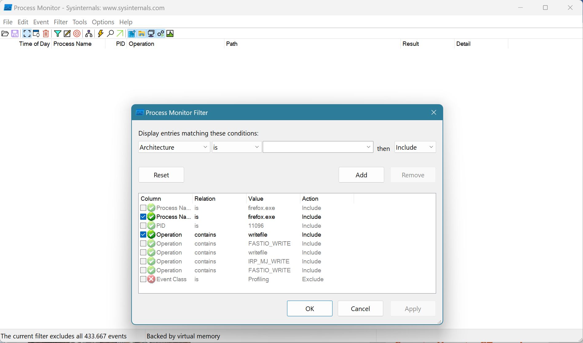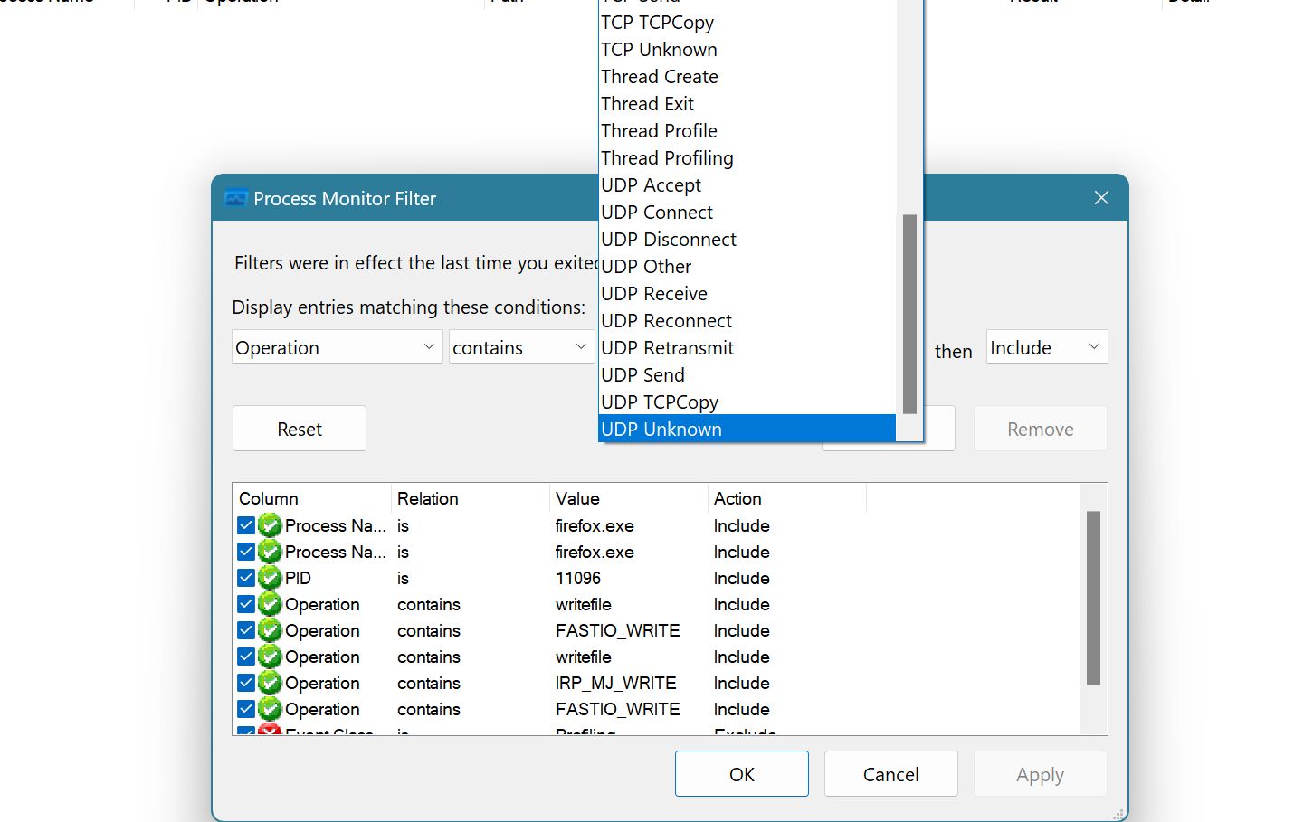 • 3.52, "etwas" älter. Ich nutze es nicht mehr so oft. Man kann es aber im Feld auch manuell eintragen, nur wie gesagt, Procmon erlaubt keine doppelten Regeln und im Bild ist "writefile" schon zu sehen.