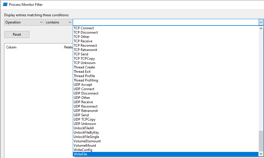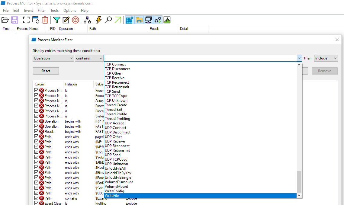 Bei ProcMon gibt es aber z.B. keine Filter-Option "writefile" und wenn ich das Wort manuell rein schreibe, kommen keine Ergebnisse. Auch alle anderen Optionen, die "write" in irgndweiner Form enthalten, liefern keine plausiblen Filterergebnisse.