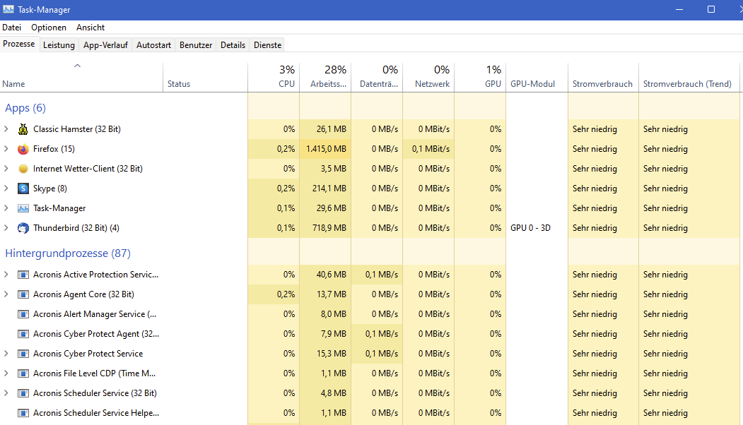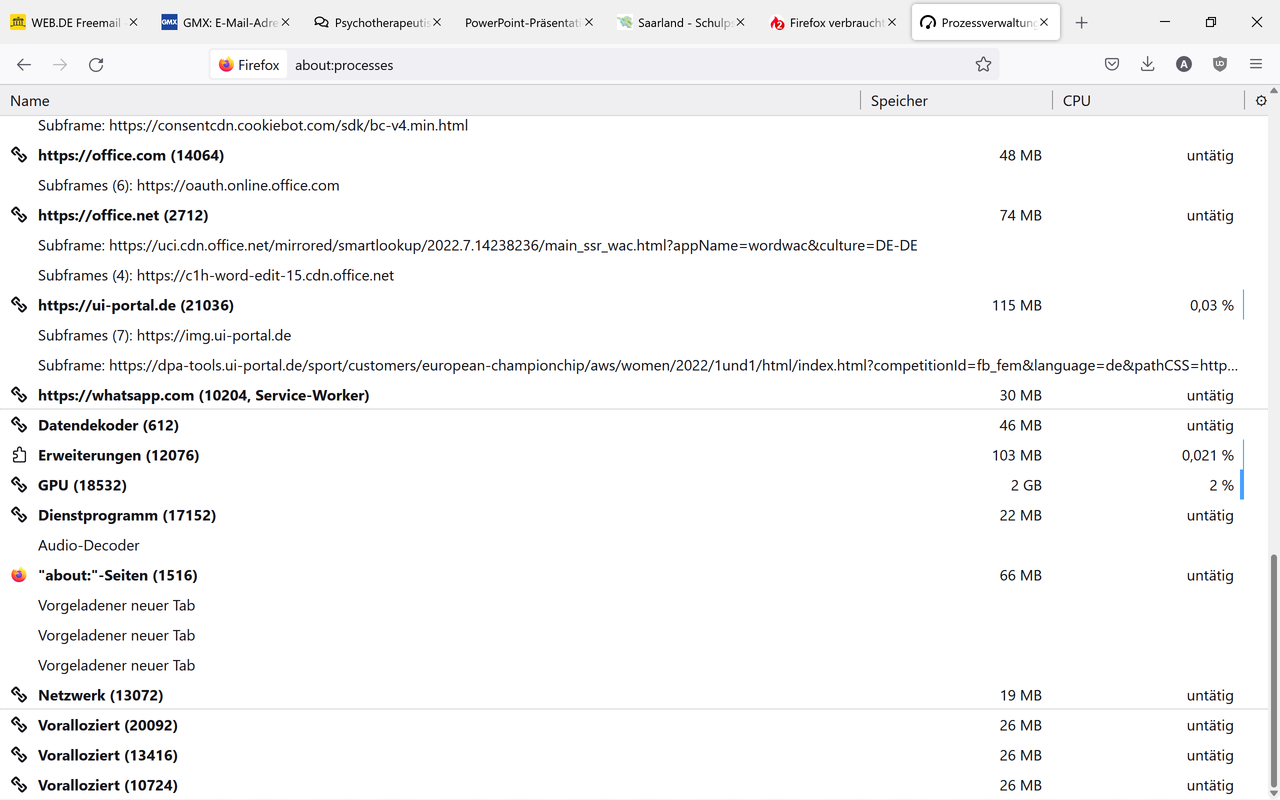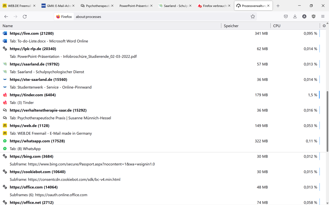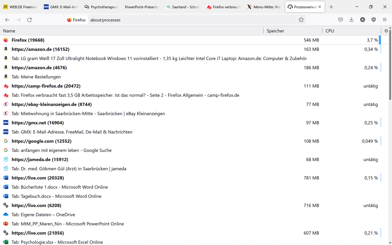 Was 'about:processes' betrifft, hat er/sie das ja schon in Beitrag #20 gepostet. Und wenn man sich das im Detail anschaut, dann fällt auf, dass schon ca. die Hälfte des Speichers durch die 'live.com'-Anwendungen von Microsoft belegt werden. Wenn sich quasi Excel, Word und andere Office Anwendungen gleichzeitig im Speicher befinden, dann wundert mich das ehrlich gesagt auch nicht. Ansonsten halte ich den Speicherverbrauch dann auch nicht für sonderlich kritisch.