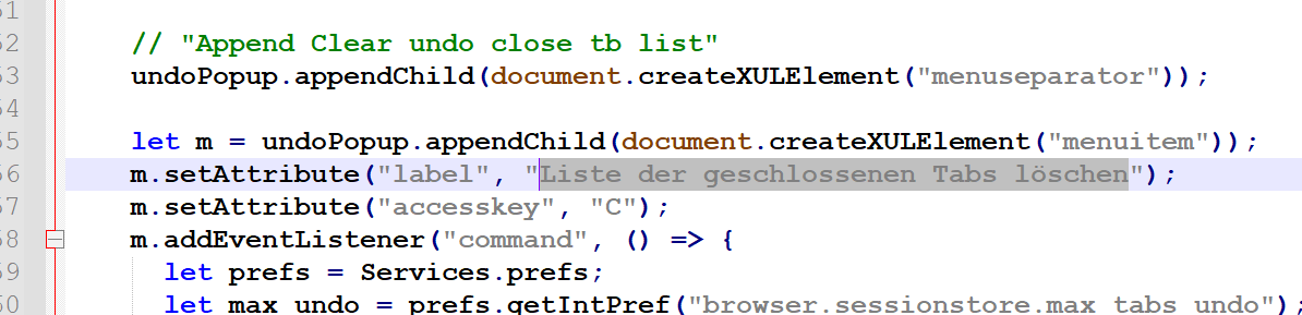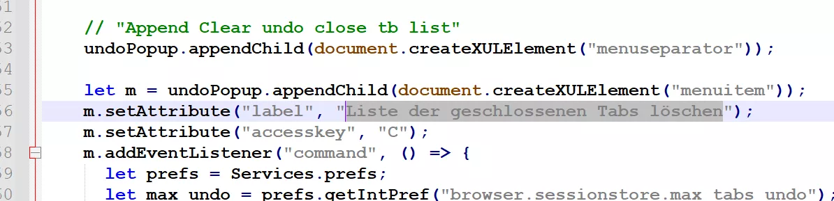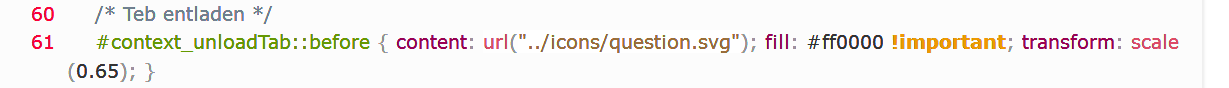 Code/* Liste der letzten Tabs löschen */ #tabContextUndoList > menupopup[hasbeenopened="true"] > menuitem.restoreallitem[label="Alle Tabs wieder öffnen"]::before, /* Liste der letzten Tabs löschen */ #tabContextUndoList > menupopup[hasbeenopened="true"] > menuitem[label="Liste der letzten Tabs löschen"]::before