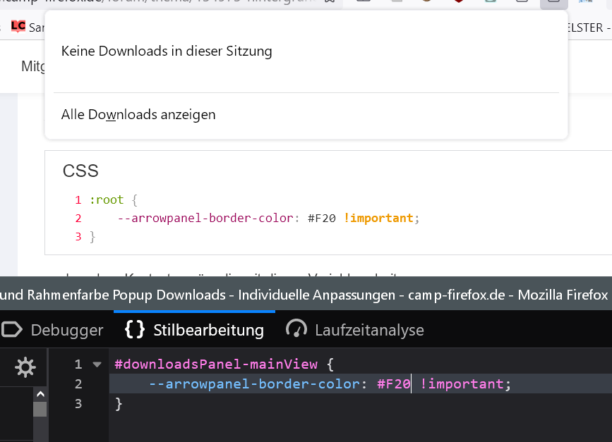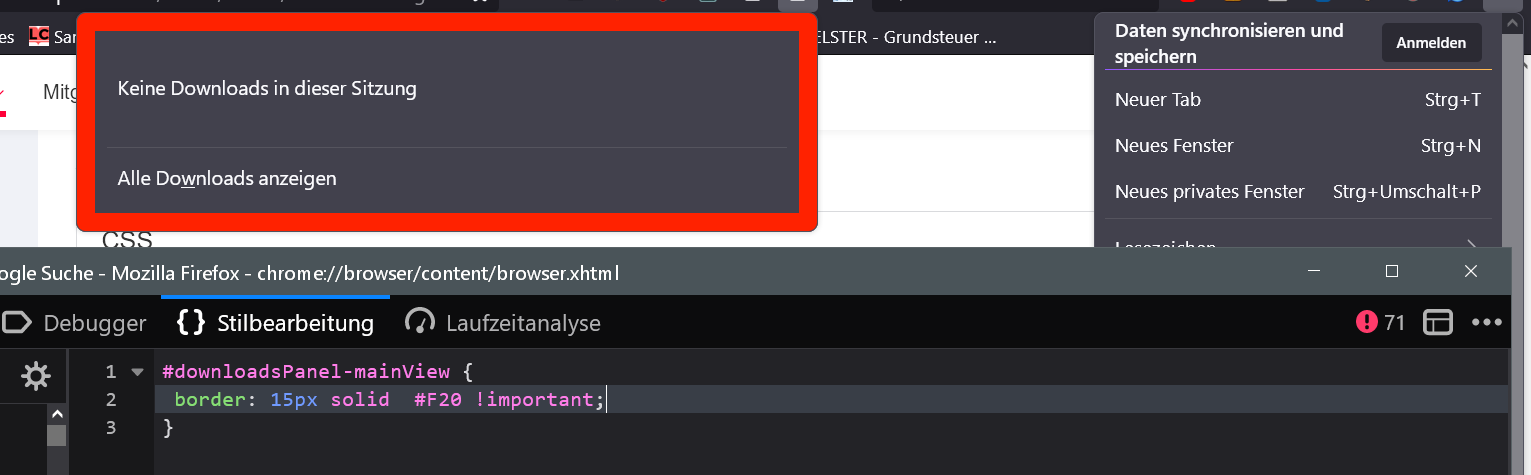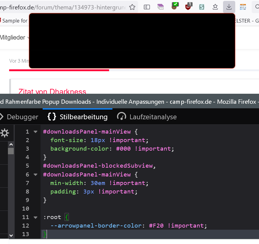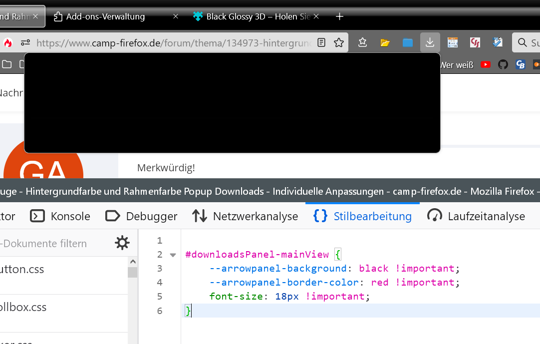 CSS#downloadsPanel-mainView { background: var(--arrowpanel-background) !important; border: 1px solid var(--arrowpanel-border-color) !important; border-radius: var(--arrowpanel-border-radius) !important; padding: var(--arrowpanel-padding) !important; }geht also lediglich in meinem Profil, meiner css.