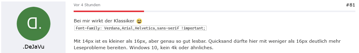 Quicksand mag nicht schlecht sein, aber die Lesbarkeit ist mit dem CSS von mir einfach besser bei kleinerer Schrift. Die Schrift davor war auch ok. #66 vs #69, so extrem ist es bei mir nun nicht, aber wenn das so bei Endor ist, dann ist das eben so. Wenn das niemand erwähnt hätte, dass hier Quicksand wirkt, wäre es mir gar nicht aufgefallen wegen des CSS.