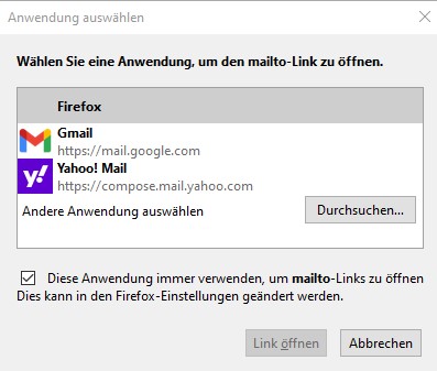 seit ich vor Jahren zu Firefox wechselte, funktioniert das Versenden von eMails direkt aus dem Browser nicht. Die Einstellungen sind o. k., aber irgendein Digitalzwerg im Innern meines Laptops hält offensichtlich immer den Daumen auf die erforderliche Schnittstelle. Das muß so sein, denn die Maske mit der Anfrage, auf welchem Wege die eMail versandt werden soll, erscheint immer auf dem Bildschirm (obwohl der Kasten anhand der Einstellungen, wie erwähnt, die Antwort bereits weiß).