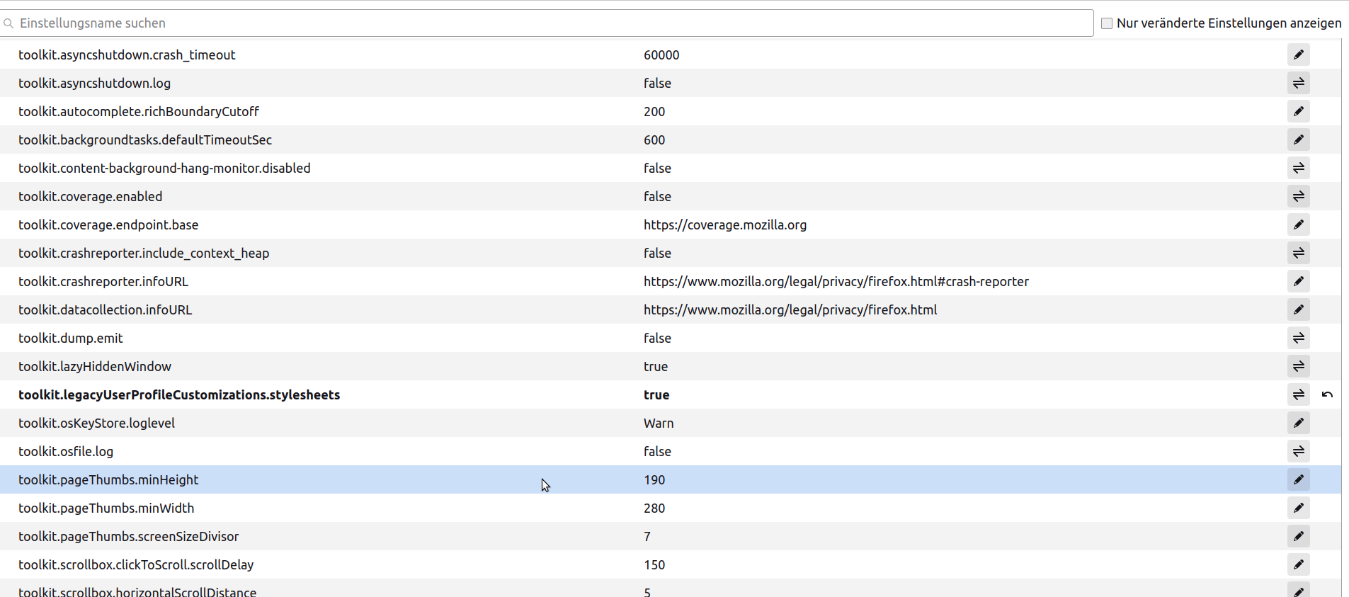 • Einfach in die Adressleiste von Firefox eingeben. Eine eventuelle Warnung bestätigen. Auf der erscheinenden Seite ist oben ein Suchfeld. Gib oben die Einstellung ein (es reicht u. U, auch ein Teil davon) und Firefox springt dahin. Klicke doppelt auf die Einstellung, dann wird der Wert umgestellt.