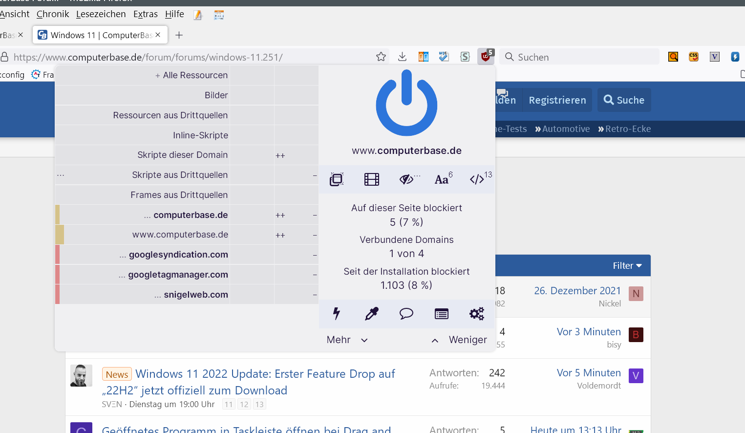 Wenn ich auf diese Webseite gehe https://www.computerbase.de/forum/forums/windows-11.251/ und ein Thema anklicke öffnet sich dieses und ich kann es lesen. Wenn ich jetzt zurückgehe und ein anderes Thema anklicke wird es nicht geladen. Der Tropper (glaube so heißt das) im Tab-Fenster links dreht sich ewig. Gehe ich jetzt ein zweites Mal auf das Thema oder auch auf ein anderes öffnet sich sofort ein neuer Tab und das Thema wird angezeigt. Das habe ich bis jetzt nur bei ComputerBase festgestellt und nur mit Firefox (auch mit einem anderen Profil) mit SlimBrowser und Edge ist das nicht der Fall. Kann das jemand bestätigen?