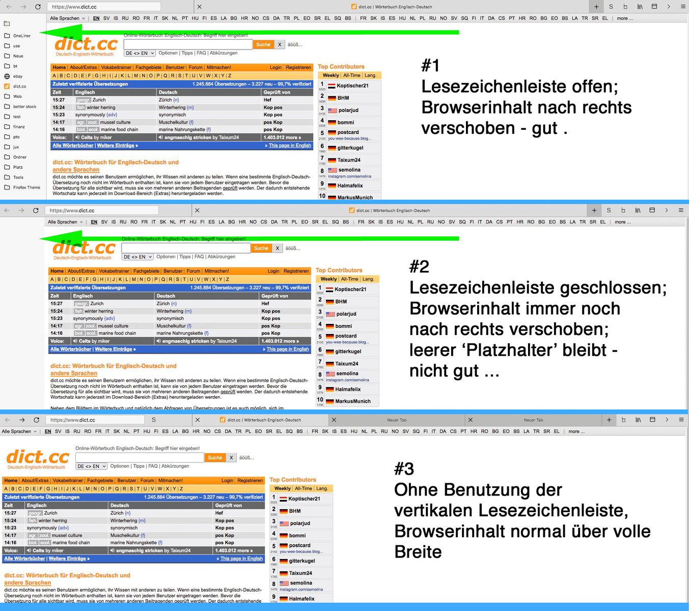 Es gibt nur einen Haken - im Gegensatz zur normalen, horizontalen Lesezeichenleiste, die beim Ausblenden aus dem Browserfenster verschwindet und den Webseiteninhalt freigibt - bleibt bei dieser Variante eine Lücke, bzw. eine Art Platzhalter zurück .