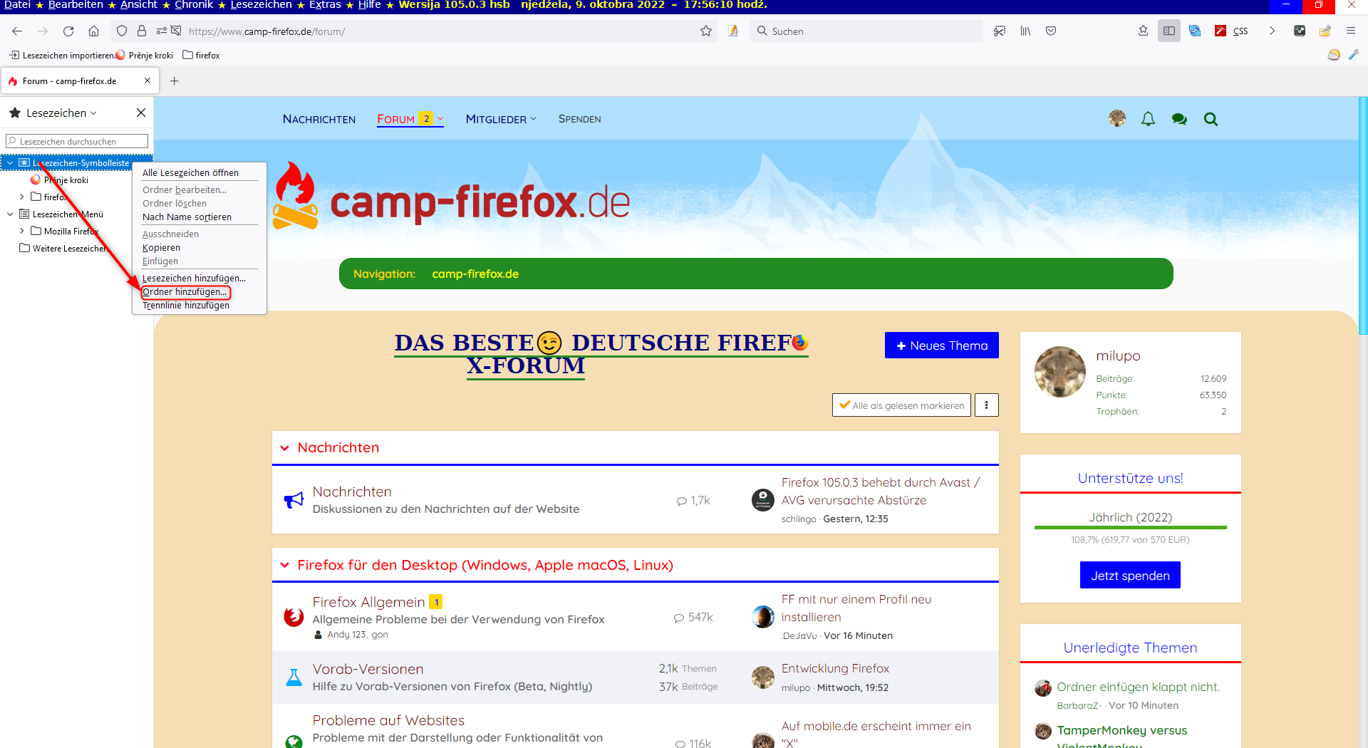 Dein Code ist für die Seitenleiste. Klicke dort mit der rechten Taste auf einen Eintrag, zum Beispiel Lesezeichen-Symbolleiste, und im Kontextmenü unten hast du dann Ordner hinzufügen…