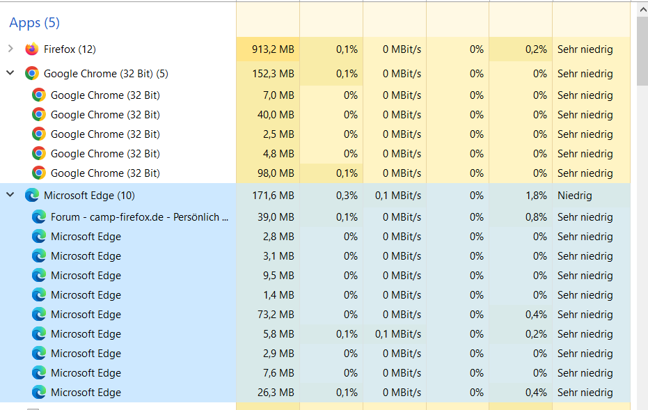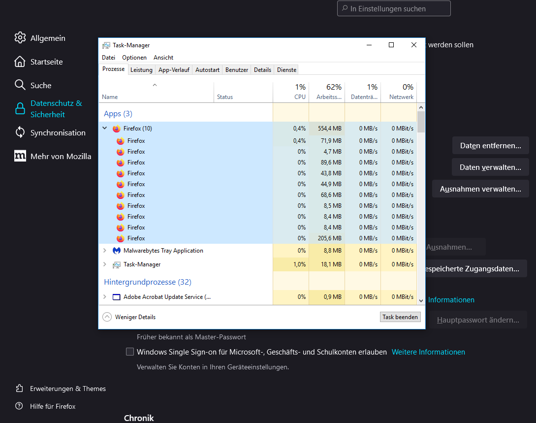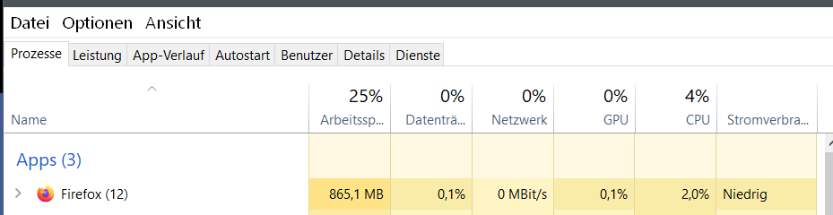 Heute morgen wieder ein ewiges Hochfahren beim Öffnen vom FF, der Task Manager zeigt "Firefox (10)" bei einem geöffneten Tab (siehe Screenshot)!