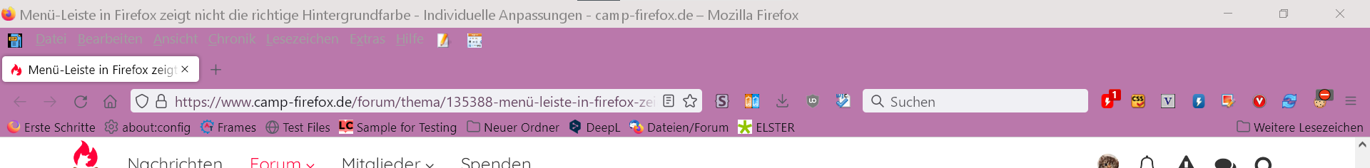 die Menü-Leiste zeigt den Hintergrund in Weiß, obwohl in "userChrome.css" schon lange der Code: #BA78AB eingetragen ist und auch funktionierte.