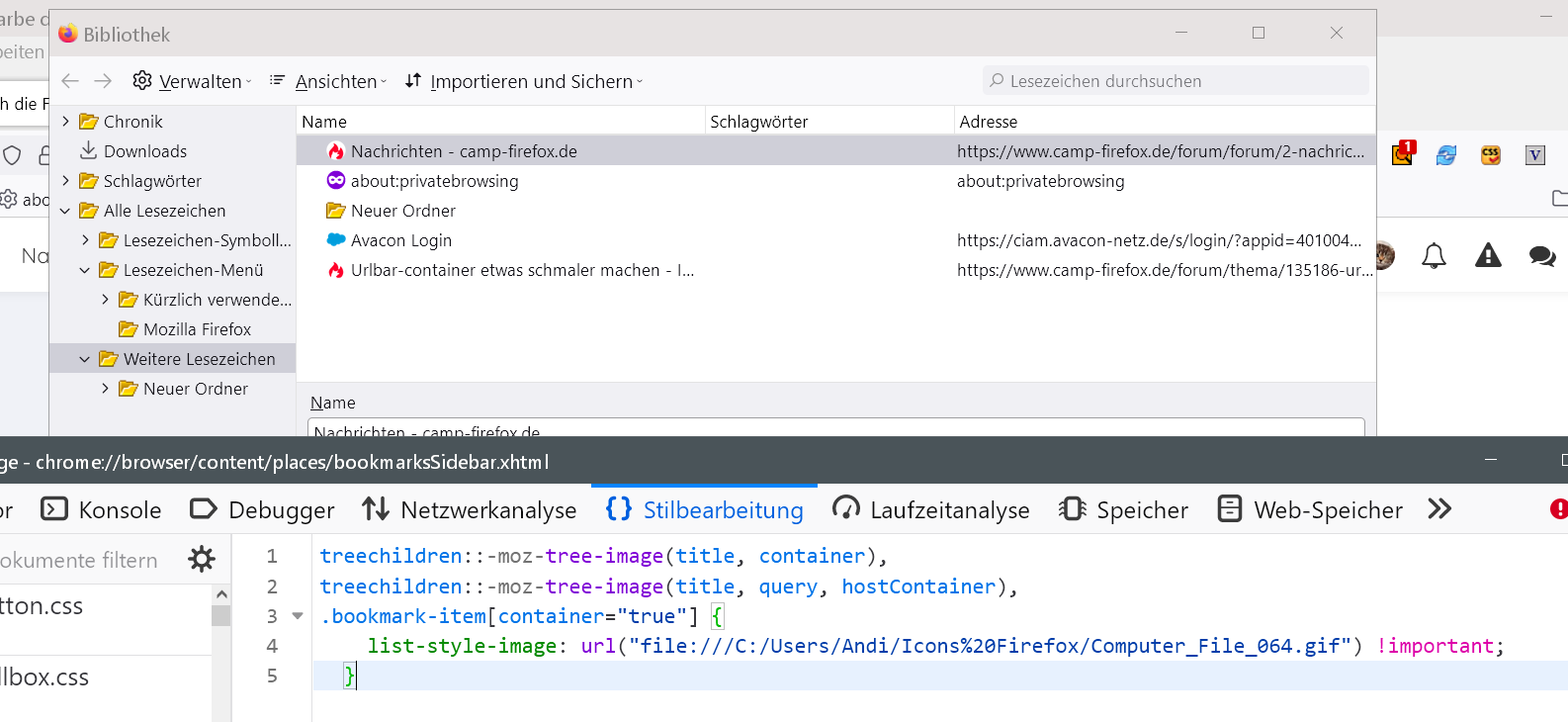 Du kannst dir die Datei auch in dein Firefox-Profil kopieren oder dort einen Link auf die eigentliche Datei ablegen, am besten im chrome-Verzeichnis oder einem Unterordner dazu. Dann könntest Du about:profiles in die Adresszeile tippen, wo dann der Pfad zum Profil zu sehen ist. Aber, wenn die userChrome.css ebenfalls dort liegt, kann man mit einer relativen Pfadangabe arbeiten, was helfen kann, wenn man das Profil mal an eine andere Stelle kopieren will.