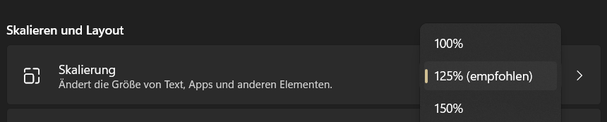 • Ich hatte damals unter "Einstellungen/ System/ Bildschirm/ Skalierung und Anordnung" den Wert auf 125% gestellt. Das war offenbar zuviel.
