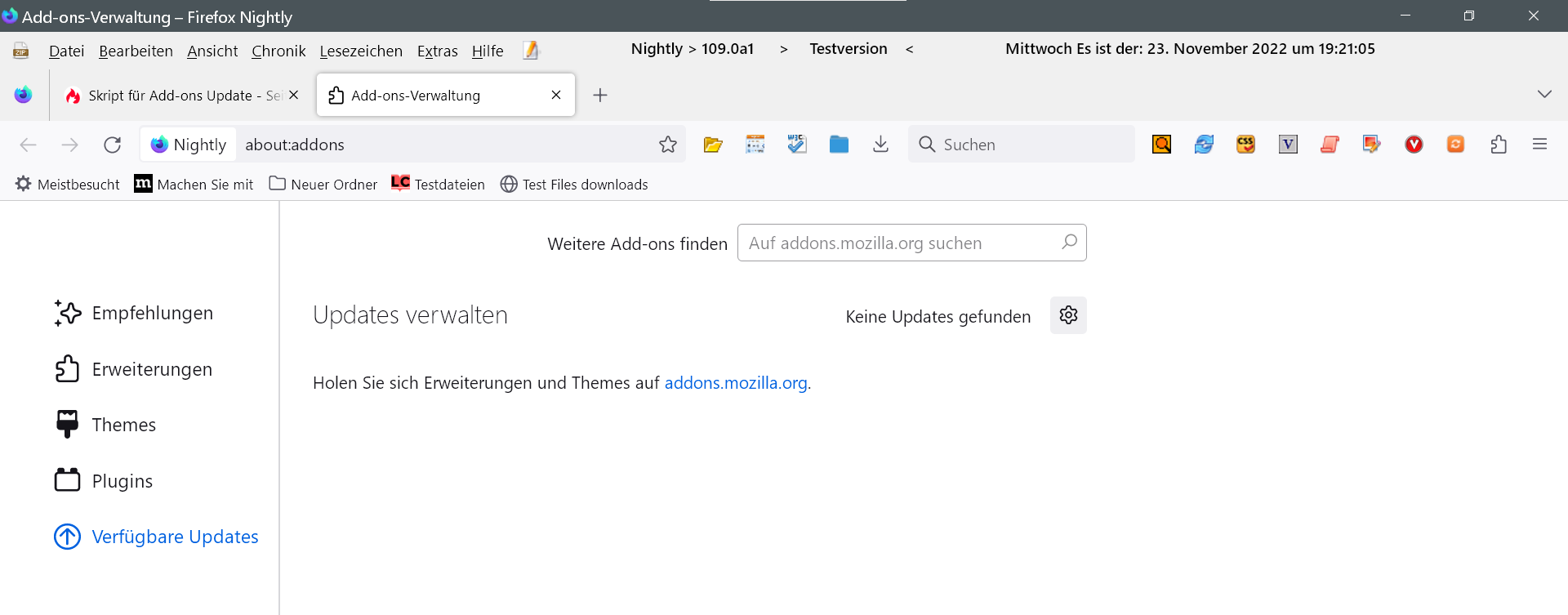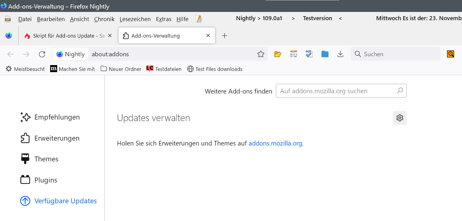 Nun hatte ich gleich im Nightly die Möglichkeit zum Test. Das Script ( von hier RE: Skript für Add-ons Update) funktioniert tadellos. Ich kann Themes einstellen, Fox beenden, Neustart und Button bedienen, und sofort öffnet sich die Seite Themes, die Add-ons-Suche läuft. Update gefunden, und es wird sofort auf "Verfügbare Updates" umgeschaltet. Perfekt!