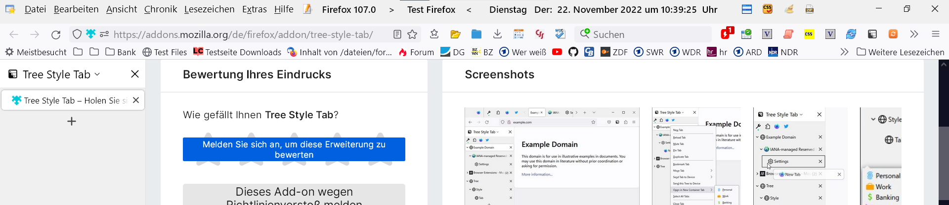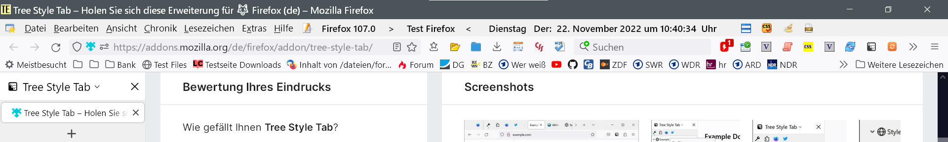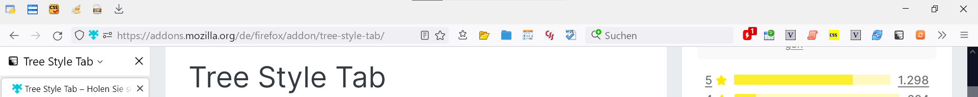 Hey, ich benutze seit vorhin Tree Style Tab und wollte daher natürlich direkt die eigentliche Tab-Leiste ausblenden, weil es ja dämlich ist, zwei Tab-Leisten gleichzeitig angezeigt zu bekommen. Direkt musste ich leicht genervt feststellen, dass dies nur mit dieser CSS-Datei im Profil möglich ist, aber habe es dann trotzdem halt umgesetzt. Direkt musste ich leicht genervt feststellen, dass dann die komplette Titelleiste kaputt ist und auch die Buttons für Minimieren etc. fehlen und man auch keine Elemente dort hin ziehen kann. Aber! Man kann die Menüleiste einblenden und schon sind die Buttons für Minimieren etc. wieder da. Direkt musste ich leicht genervt feststellen, dass man das Adress-Eingabefeld nicht dort hin ziehen kann. Aber! Man kann immerhin die Lesezeichen-Leiste dort rein ziehen. Direkt musste ich leicht genervt feststellen, dass die Menüpunkte Datei, Bearbeiten etc. ziemlich viel unnötigen Platz in der Leiste einnehmen, vertikal nicht zentriert sind, sondern oben am Rand kleben, und es dafür zudem keine einfache Lösung zu geben scheint…