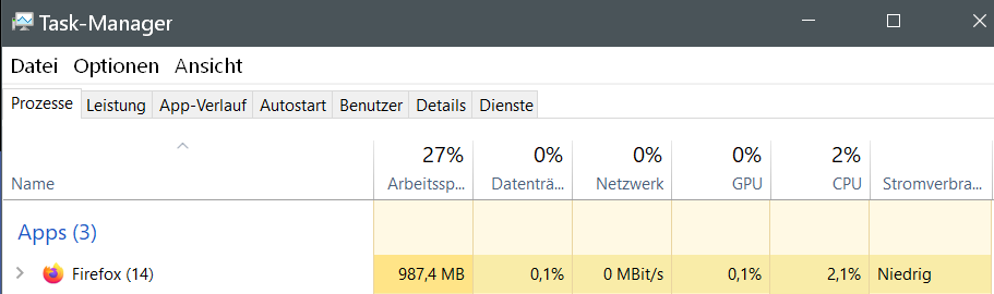 Heute ging es aber nicht mehr. Seit zwei-drei Tagen läuft mein RAM (8GB) bis zur Auslastung 100% voll. Der ganze PC wird unerträglich langsam. Ein Beispiel: Der TAB mit der Seite WELT.DE belegte innerhalb von 2 Stunden nach Neustart des Firefox 6GB RAM (Im Firefox-Taskmanager ausgelesen).