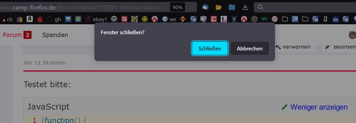 Ich öffne mal wieder dieses alte Thema. Seit über 2 Jahren hat dieses Skript aus #47 mir gute Dienste geleistet, um auch beim Schließen des FF über das x bei nur einem Tab die Abfrage zu erhalten. Nun schließt sich der Firefox, egal wie viele Tabs ich geöffnet habe. Wenn ich das Skript entferne, habe ich die Abfrage bei mehreren Tabs, beim letzten schließt sich der Browser.