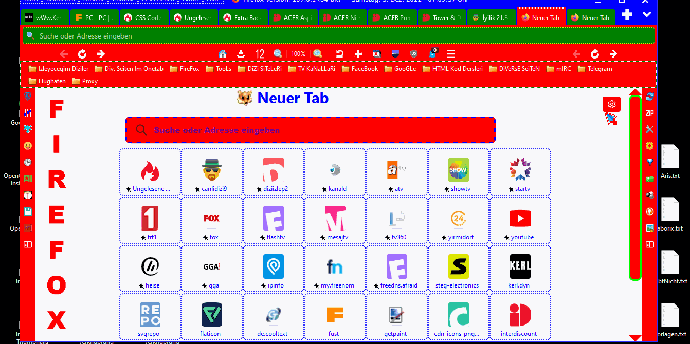 :thumbup: funkt tiptop, aber leider kann ich meine Icons nicht im Script einbinden. Gibt es eine Lösung wie ich es machen kann? Ich kann nur 1 Icon benützen wenn ich button.style.listStyleImage = 'url(chrome://browser/skin/' + str + '.svg)'; zu button.style.listStyleImage = 'url("file:///C:/Users/askas/AppData/Roaming/Mozilla/Firefox/Profiles/use9514s.default-release/chrome/Icons/arbackN.png")'; ändere.