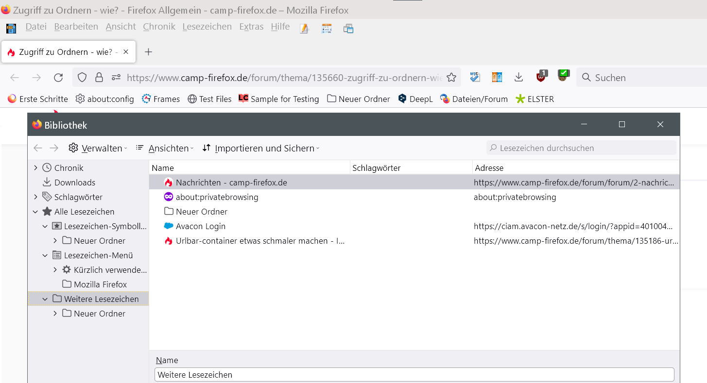 Ich habe beim "Verbessern" der Organisation meines Notebooks bei Firefox einiges durcheinander gebracht. Genauer gesagt, ich brauche jetzt zu "Rettungsarbeiten" Zugriff zu den "Ordnern" (s. Bild) - weiß aber nicht, wo/wie diese abgelegt sind. Kann mir bitte jemand von Euch auf die Sprünge helfen?