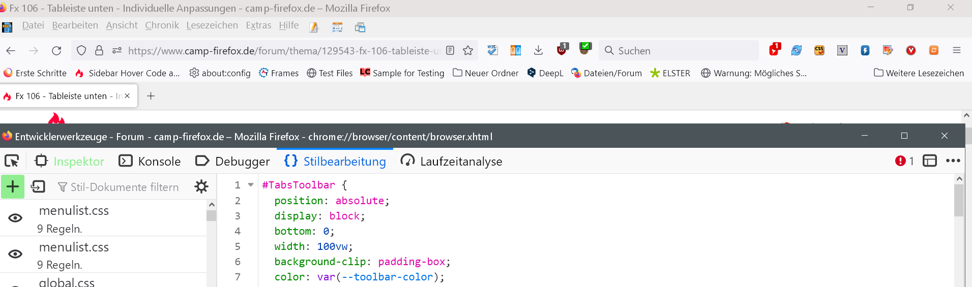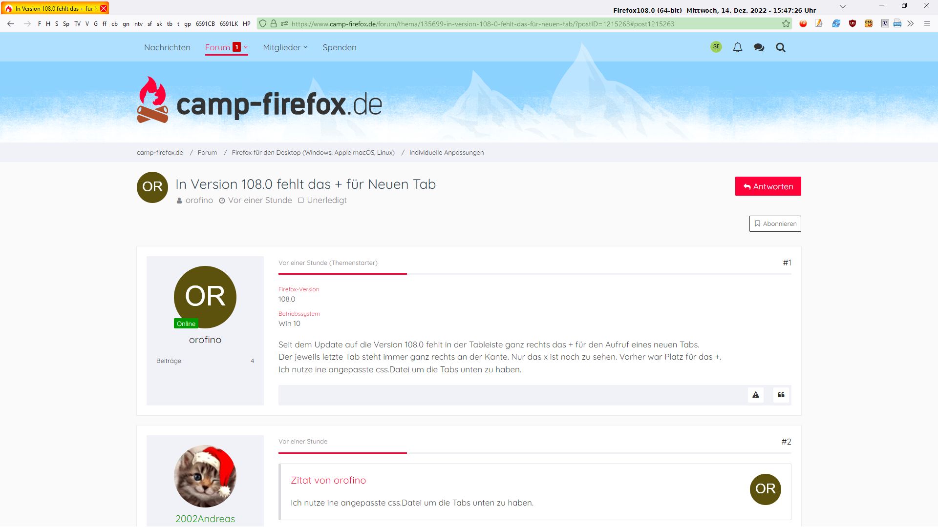 In Version 108.0 fehlt mir das + für Neuen Tab