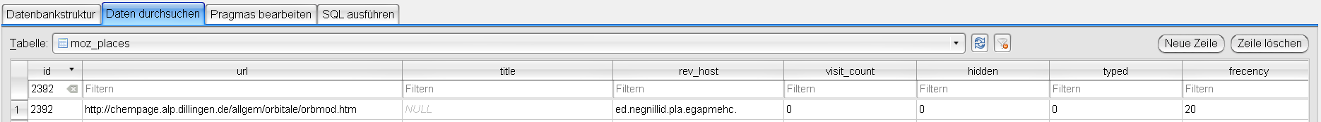 Du hast übersehen, dass die Datenbank places.sqlite mehr als eine Tabelle besitzt und es eine Beziehung zwischen diesen Tabellen gibt.