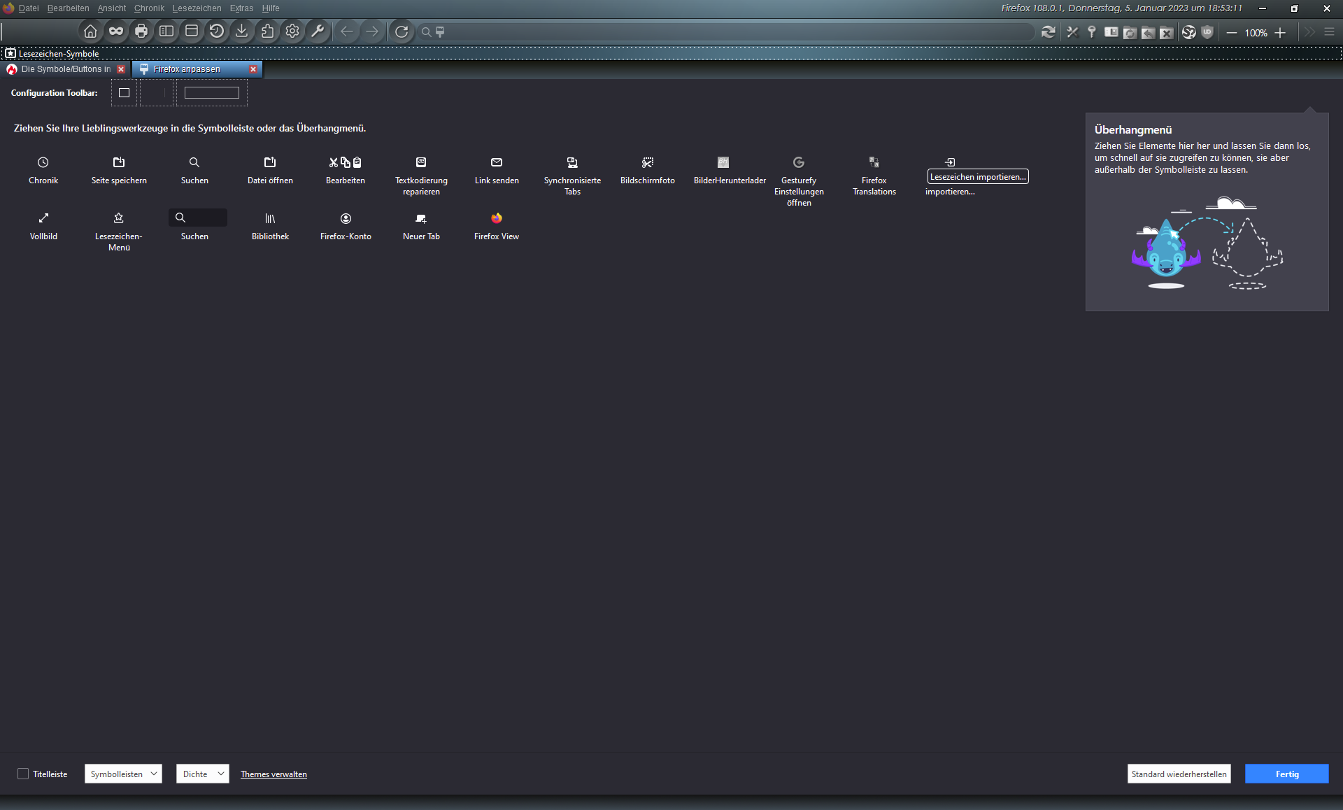Was passiert denn, wenn man das Anpassenfenster öffnet, und die Symbole aus dem Überhangmenü mal nach links in die Navbar zieht?