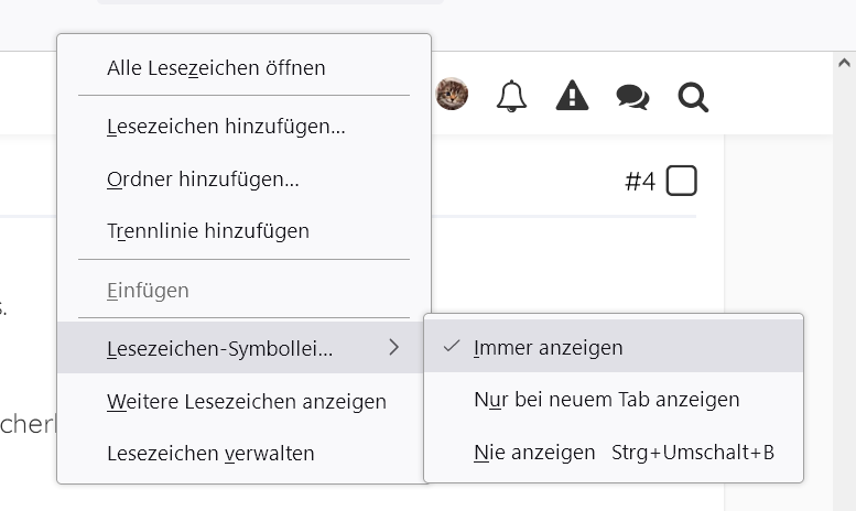 Und dann den Haken setzen für die Lesezeichen-Symbolleiste: Immer anzeigen