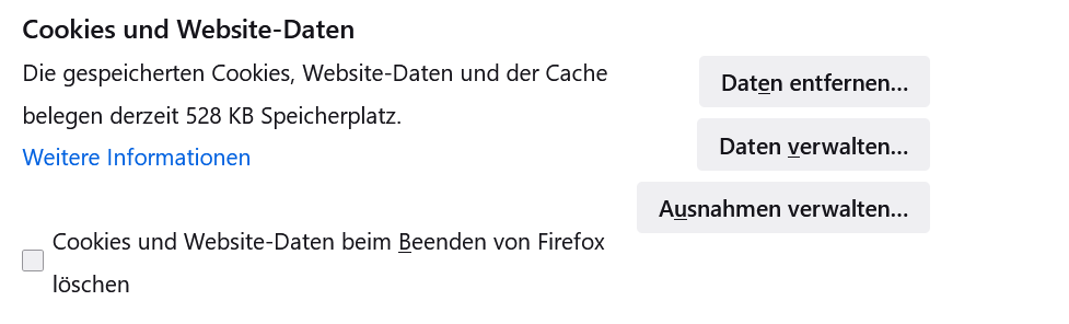 • der Punkt "Cookies und Webseiten-Daten beim Beenden von Firefox löschen" eingestellt ist