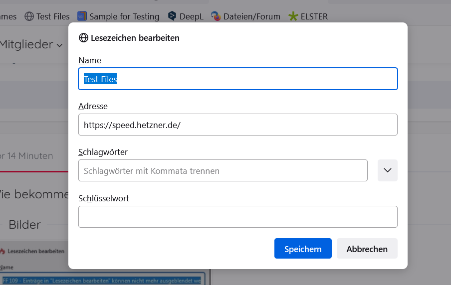 Bisher hatte ich im Feld "Lesezeichen bearbeiten" die Einträge Schlagwörter und Schlüsselwort mit folgendem Code in der userChrome.css ausgeblendet: