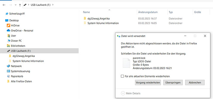 • Wolfgang1 war das neueste Profil vom alten Ordner, d.h. vom TB, das funktioniert.