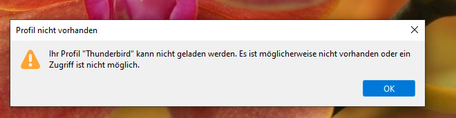 Es gibt noch die Möglichkeit im Pfad der Verknüpfung das gewünschte Profil anzugeben. Und wenn es das dann nicht mehr gibt, kommt natürlich der Fehler. Aber du startest ja mit thunderbird.exe -p, da kommt der Profilmanager und dort musst du das richtige Profil auswählen. Und wenn du jetzt im Profilmanager das falsche Profil auswählst, kommt natürlich auch der Fehler. Du müsstest eigentlich jetzt wissen, wie das funktionierende Profil jetzt heißt.
