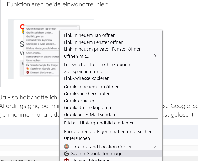 bis Ende letzten Jahres konnte ich bei Bildern mit der Maus einen Rechtsklick machen und im "Popup" aussuchen, ob ich das Bild über TinEye oder Google-Bildersuche oder Google-Lens suchen möchte (um zb zu schauen, ob das Bild zum Text passt).
