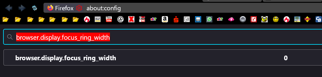 • browser.display.focus_ring_width auf 0 zu stellen ist nur ein Workaround und keine Behebung der Ursache, denn der Standardwert ist 1 und damit passiert das beschriebene Verhalten unter normalen Umständen nicht. Am Beispiel der in Beitrag #1 genannten Seite support.mozilla.org ist das ausschließlich der :focus-visible-Stil, sollte also nur bei Navigation per (üblicherweise) Tastatur sichtbar sein. Wenn das bei einem Klick passiert, sprich das stark dafür, dass ein Barrierefreiheits-Werkzeug aktiviert ist. Und das hat dann im schlechtesten Fall auch noch Auswirkungen darüber hinaus, vor allem für die Performance. Deswegen besser die Ursache finden und beheben als nur zu maskieren.