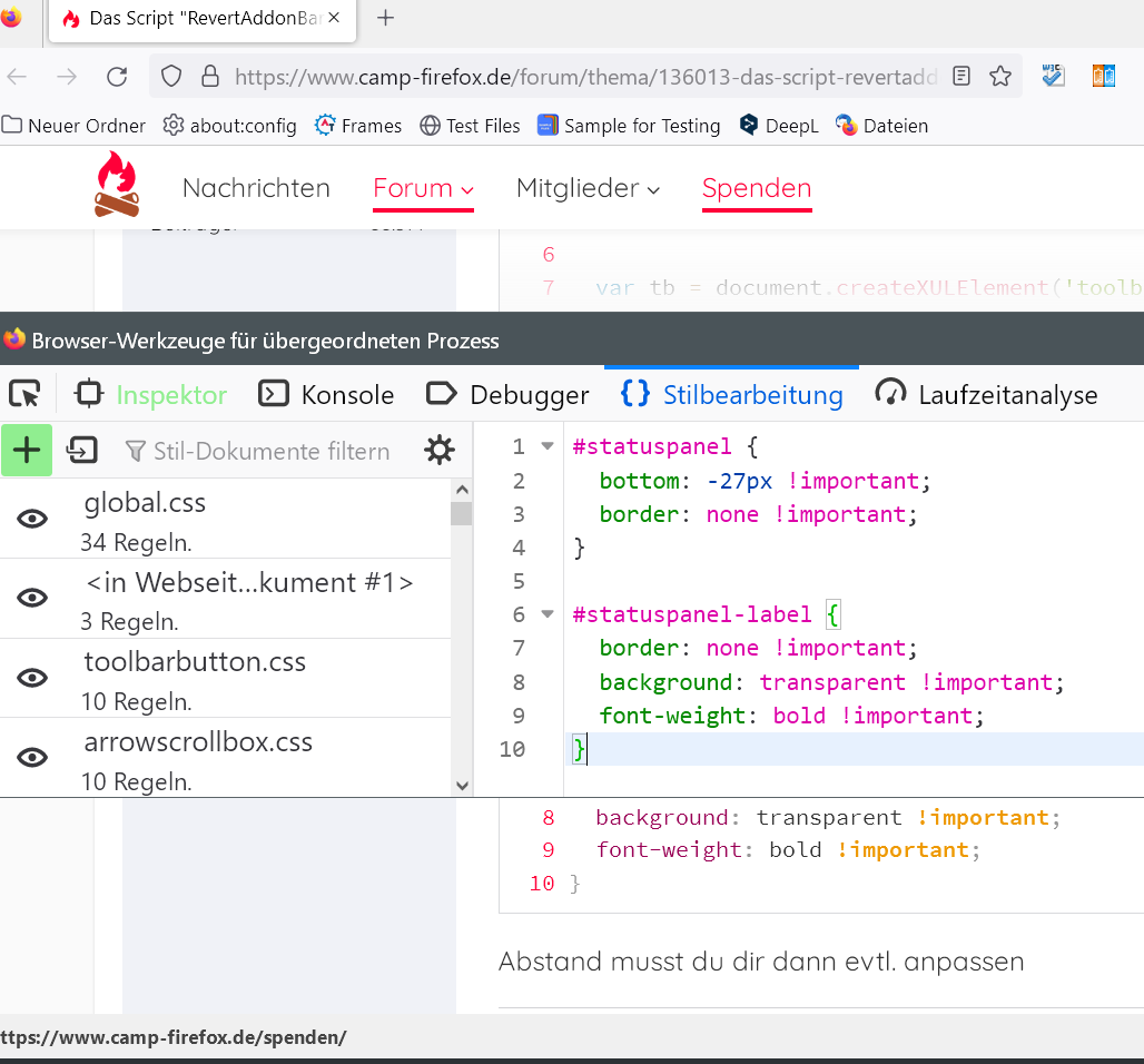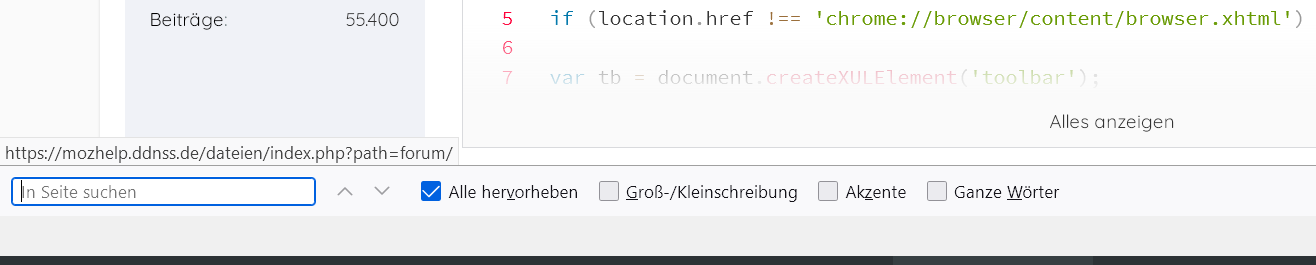 Seit einigen Versionen gibt es keine permanent vorhandene Statusbar mehr. Die Url wird über der Statusbar angezeigt, wenn man den Cursor über eine Url hält, ohne Statusbar links am unteren Rand des Firefox Fensters. Da ich den Passwortmanager Roboform benutze, und auch die untere Roboform-Symbolleiste aktiviert habe, wird die Url von dieser Leiste verdeckt. Deshalb empfand ich es als sehr praktisch, mit dem Script RevertAddonBarStatusBar.uc.js eine permanent vorhndene Statusbar zu erzeugen. Diese wird zwar auch von der Roboform-Leiste verdeckt, aber da sie gewöhnlich keinen Inhalt hat, macht das nichts. Wesentlich ist, daß die permanente Statusbar nun die Url gewissermaßen nach oben schiebt über die Roboform-Leiste.