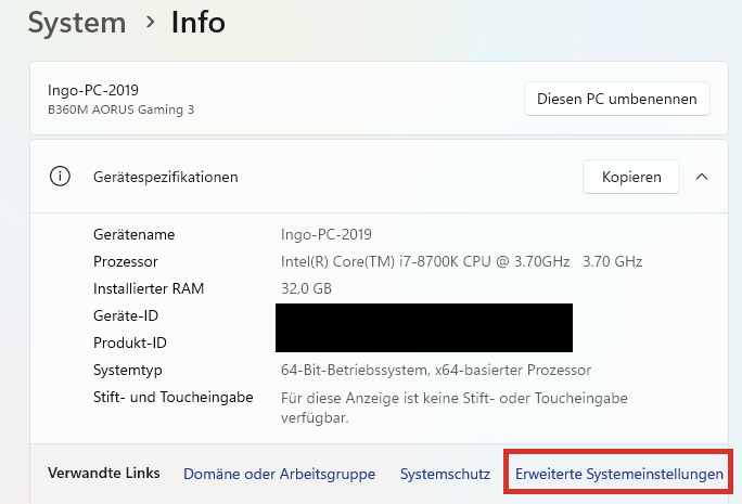 Drücke Win-Pause und klicke dann bei den verwandten Links rechts auf Erweiterte Systemeinstellungen.