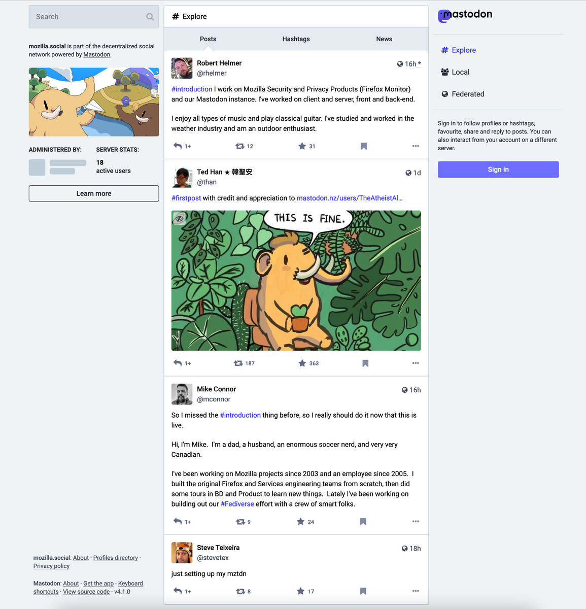 Kannst du dann ja bald auf https://mozilla.social, dessen interner Test nun gestartet ist. Noch sind Registrierungen geschlossen, sollte aber nicht mehr so lange dauern, bis es geöffnet wird. ![]()