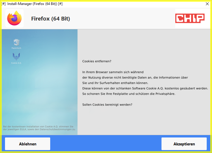 • Eigentlich sollte es egal sein welches Programm man von chip.de lädt. Die Dinge werden nachgeladen und wenn ich morgen den Installer erneut ausführen würde, könnte es gut sein dass andere "Angebote" darin sind.