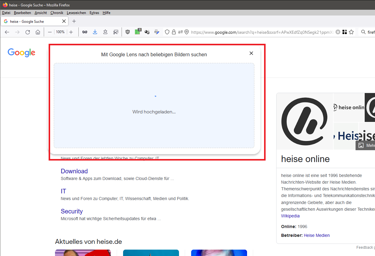 Gehe ich hier so vor wie üblich öffnet sich dabei ein Fensterchen 'Mit Google Lens nach beliebigen Bildern suchen'. Lasse ich den Link innerhalb dieses Fensterchen los öffnet sich zwar wie gewünscht ein neuer Tab, die ursprüngliche Seite wechselt dann aber zu den Lens-Suchergebnissen. Siehe Bilder.