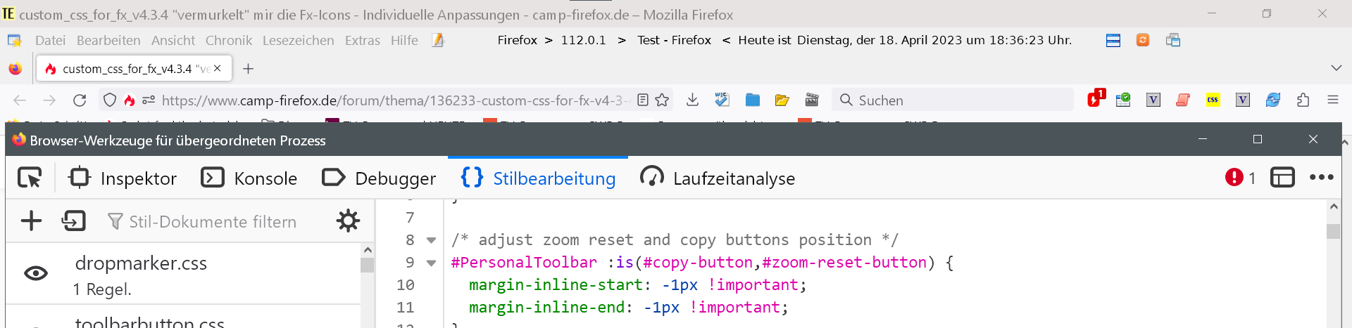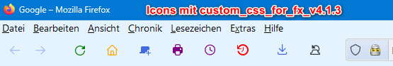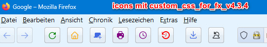 nach dem Fx-Update von 111 auf 112 funktionierten Teile von custom_css_for_fx_v4.1.3 nicht mehr so richtig. Erst machte ich mich auf die Suche nach Korrekturen und entschied mich dann aber auf custom_css_for_fx_v4.3.4 umzusteigen. War 'ne gute Idee, denn jetzt waren die vorherigen "Fehler" behoben.