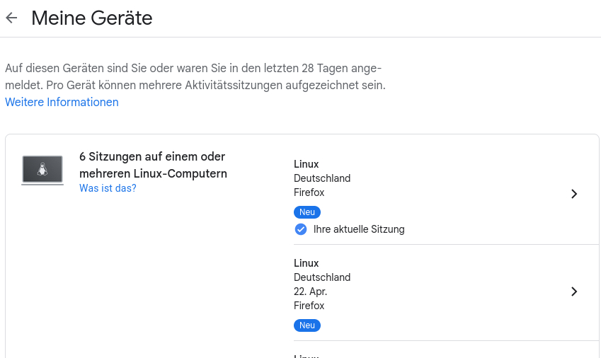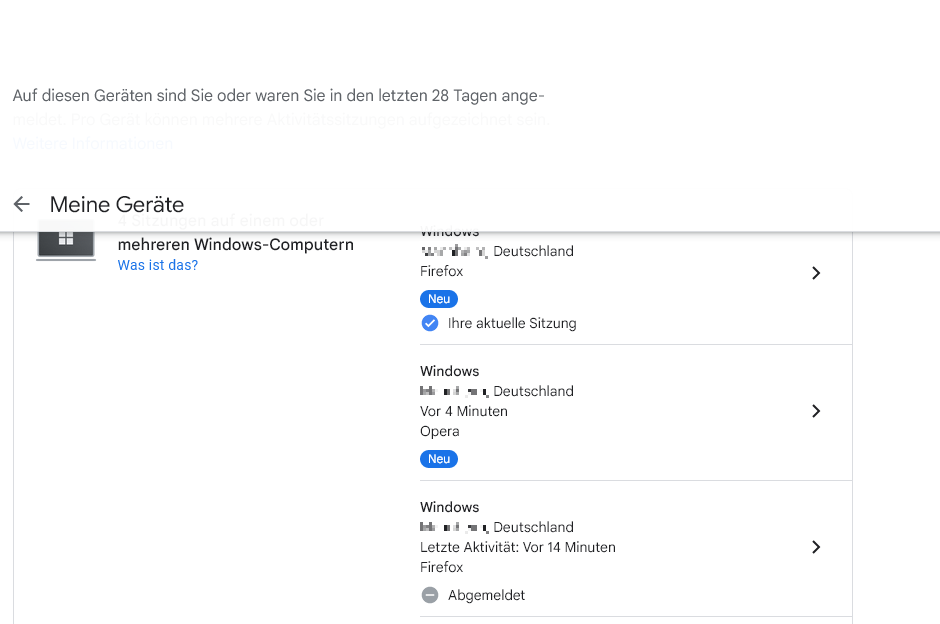 Auf diesen Geräten sind Sie oder waren Sie in den letzten 28 Tagen angemeldet. Pro Gerät können mehrere Aktivitätssitzungen aufgezeichnet sein.