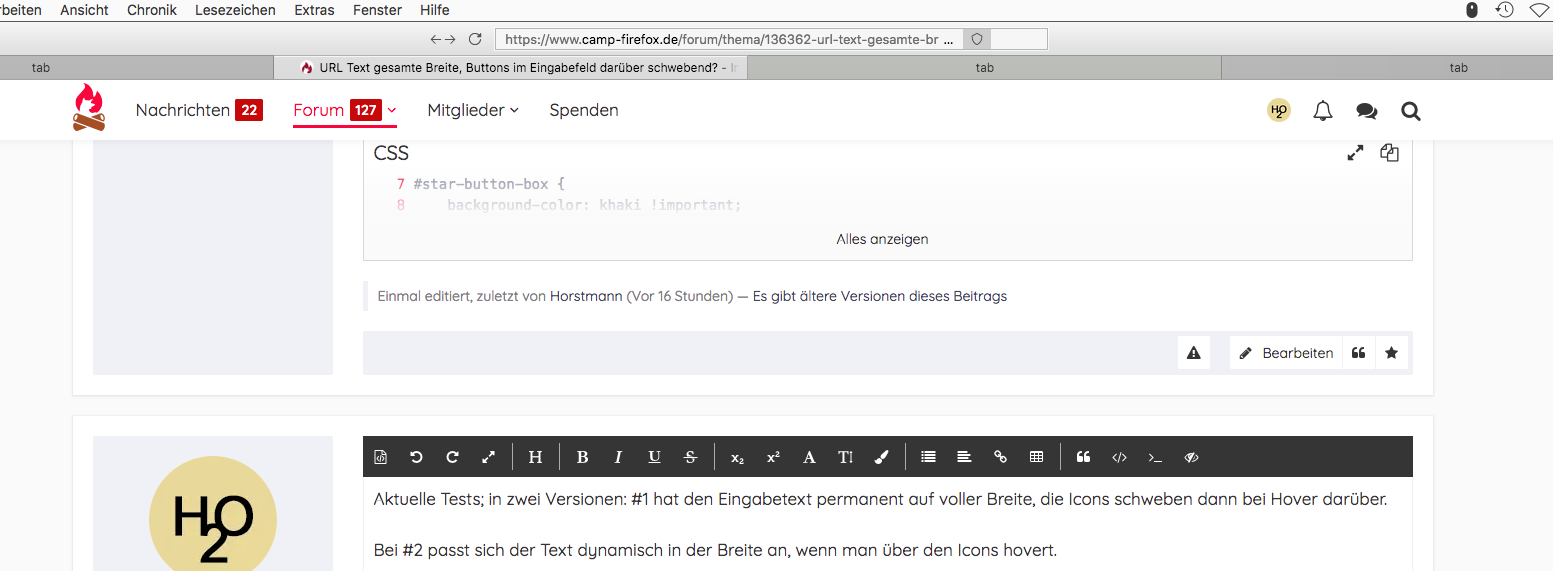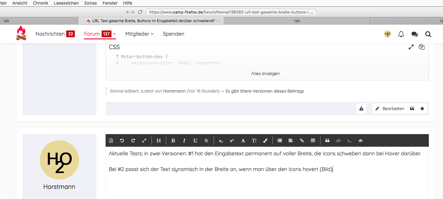 Wie man sieht, ist rechts die reservierte Lücke für die Buttons; ich würde das aber gerne ändern, und den Text im Eingabefeld permanent auf voller Breite haben; die Buttons sollten dann bei Hover über diesen Buttons auftauchen, und über dem Text quasi `schweben', bzw. ihn überlagern.