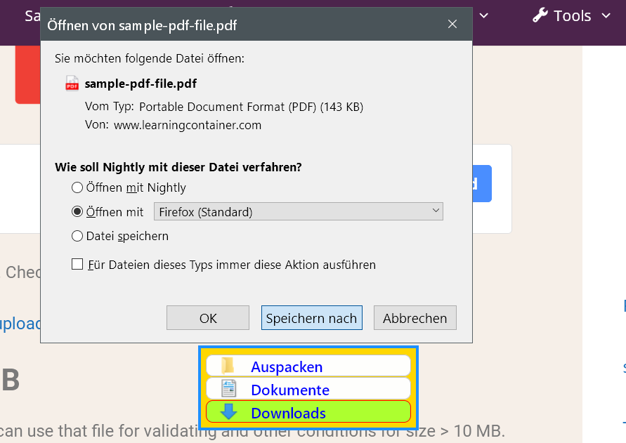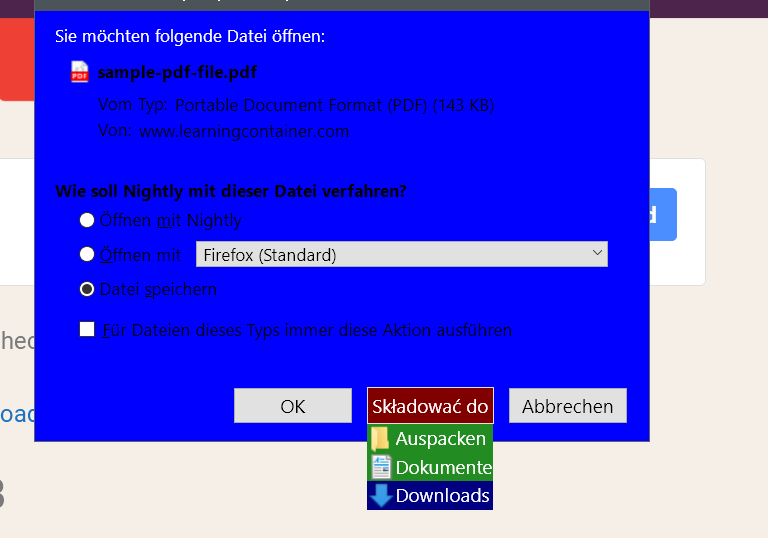 Das stimmt im Nightly, "Datei speichern", und wird dann mit verknüpftem Prog geöffnet. ![]()