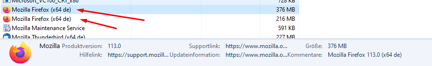 Ich habe das selbe Problem, immer wenn ich ein Update mache, erscheinen unter Programme 2 Versionen, also zBs. 113.0 und einmal 113.0.1 und wenn ich aber eine davon deinstalliere dann deinstalliert er sofort beide!