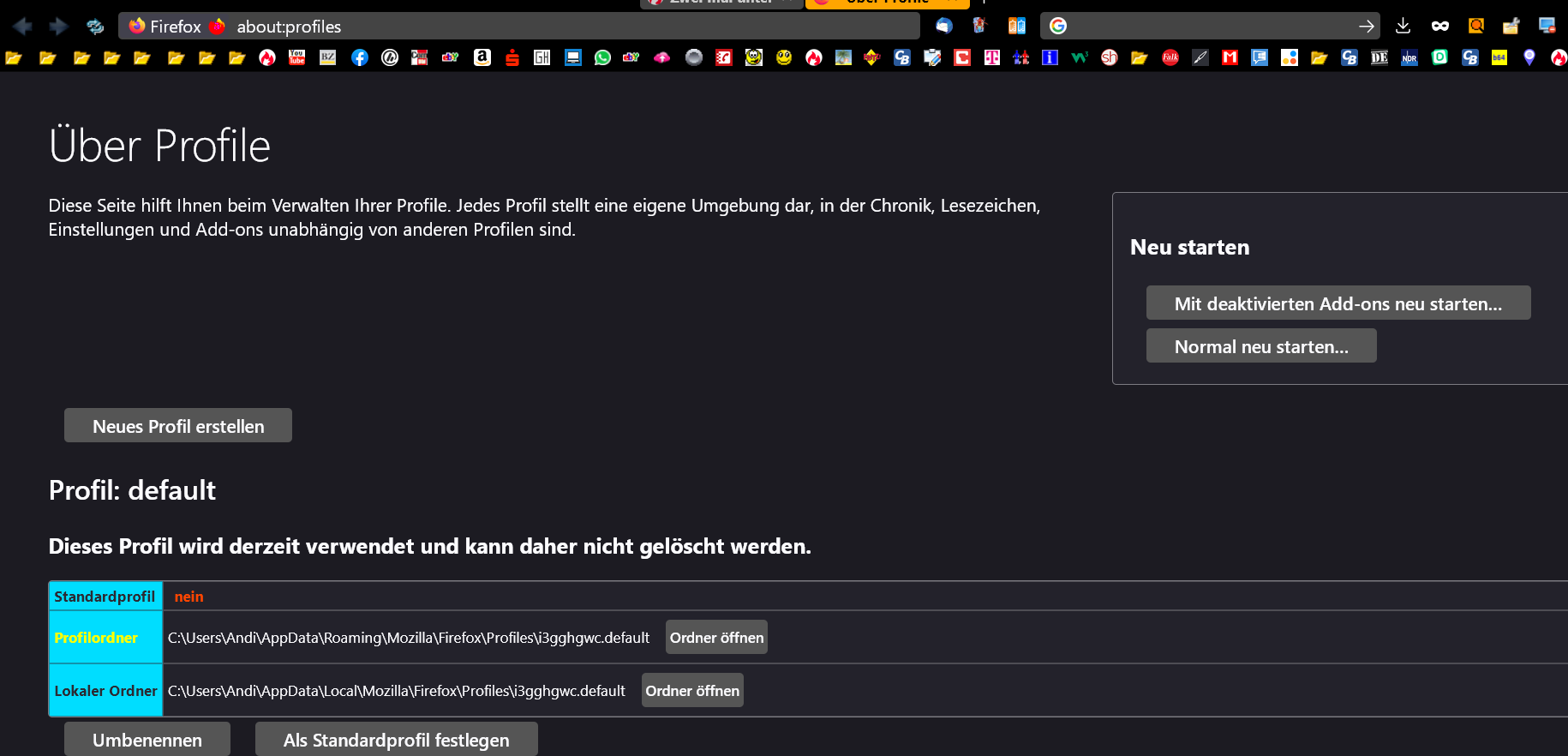 Für Profile bitte "about:profiles" in Firefox aufrufen, es müssten mindestens zwei drin stehen: default und default-release.