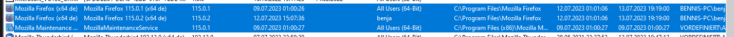 Mozilla Firefox (x64 de) Mozilla Firefox 115.0.1 (x64 de) 115.0.1 09.07.2023 01:00:26 All Users (64-Bit) C:\Program Files\Mozilla Firefox 12.07.2023 01:01:06 13.07.2023 19:19:00 BENNIS-PC\benja Mozilla "C:\Program Files\Mozilla Firefox\uninstall\helper.exe" "C:\Program Files\Mozilla Firefox\uninstall\helper.exe" /S Mozilla Firefox 115.0.1 (x64 de) https://www.mozilla.org https://www.mozilla.org/firefox/115.0.1/releasenotes https://support.mozilla.org Nullsoft Install System C:\Program Files\Mozilla Firefox\firefox.exe 224.448 KB No Modify, No Repair HKEY_LOCAL_MACHINE\Software\Microsoft\Windows\CurrentVersion\Uninstall\Mozilla Firefox 115.0.1 (x64 de)