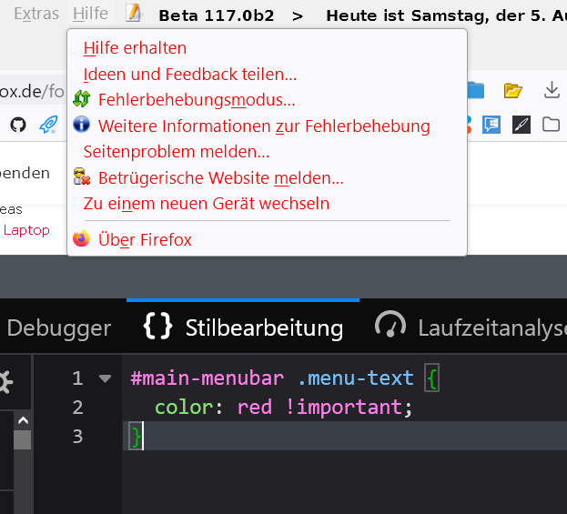 Ich muß nochmal auf den Thread zurückkommen. Ich habe Firefox auf Version 117.0b3 upgedatet. Jetzt hat sich zwar an den Menüicons nichts geändert, es ist nun aber der Menütext ganz dicht ohne jeden Abstand an die Icons herangerückt. Wie kriegt man da wieder einen Abstand hin?