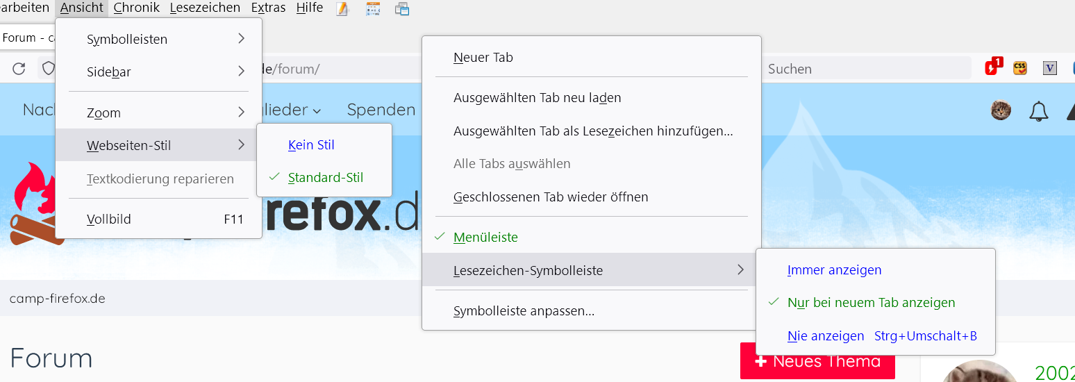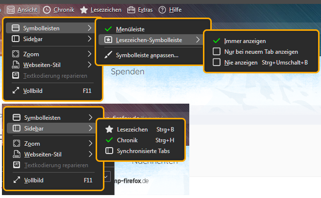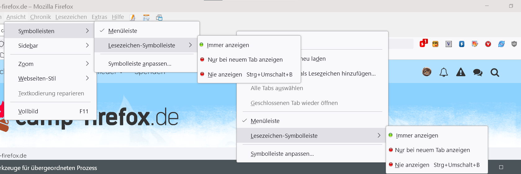 sowie im weiteren Untermenü von Lesezeichen-Symbolleiste (hier ist es "immer anzeigen").