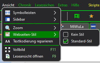 Im Untermenü "Webseiten-Stil" hat bei mir merkwürdigerweise der Untermenüpunkt "Kein Stil" einen grünen Haken. Der Haken bei "Standard-Stil" ist grau. Meines Erachtens müßte der Haken bei "Kein Stil" ganz verschwinden, da diese Option nicht ausgewählt ist, und bei "Standard-Stil" sollte der Haken grün sein.