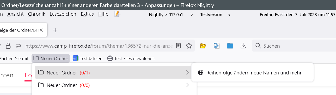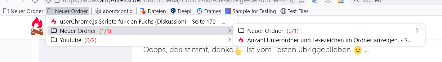 label.setAttribute('data-value', strCountOut); keine Ausgabe erfolgt. Wenn ich einen anderen "Elternknoten" benutze, dann zeigt er etwas an. Es wäre gut, wenn diese Leute mal dieses geänderte Skript testen würden (nicht wundern, im Skript befinden sich massig Log-Meldungen, die Infos ausgeben; die Ausgabe im Lesezeichen-Menü erfolgt hierbei rechtsbündig, vor dem Pfeil):