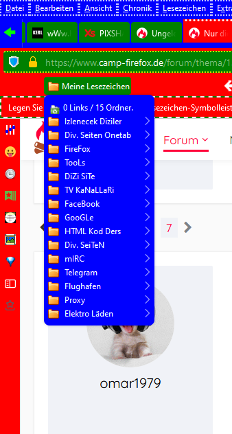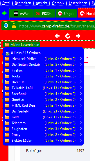 Ich benütze den Lesezeichen-Button nicht und die Lesezeichen-Symbolleiste auch nicht. Wenn ich meine Lesezeichen-Ordner auf eine Zusatz-Leiste verschiebe, dann funkt das Script nicht.