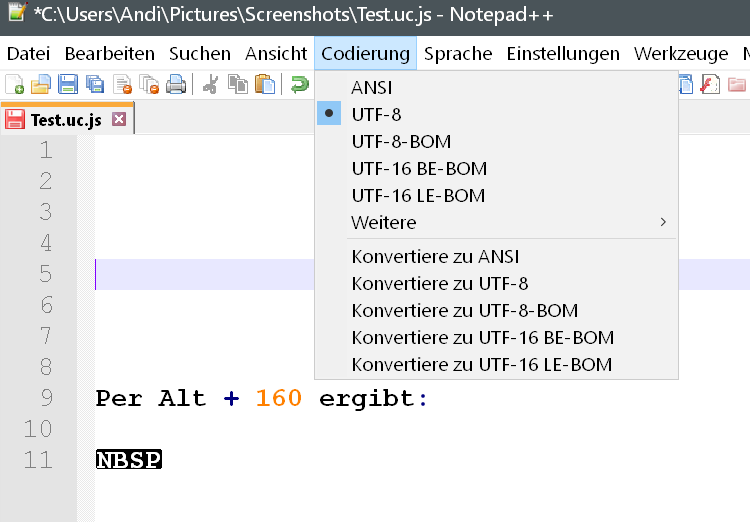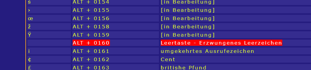 • Alt+160 gilt eigentlich für ISO-8859-1.